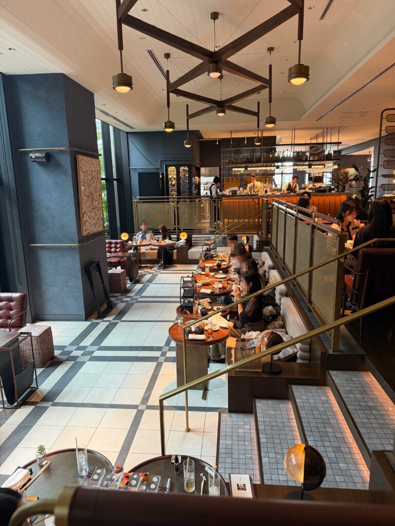白い大理石の床に、黒い壁、そしてブラウン貴重の家具で温もりがプラスされたラウンジ。大きな窓から秋の柔らかな光が差し込むので、どの席も特別感じがあります。