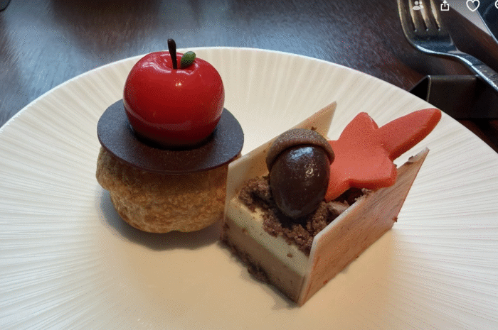 艶々のりんごにりんごの香りがするシュークリーム!そして、チョコのどんぐりとこれまたホワイトチョコで作った楓がのった、ヘーゼルナッツと洋梨の2層のムース、ポアールノアゼット。キンプトンのスイーツはおしゃれな上に、味が抜群なんです。美味しい〜