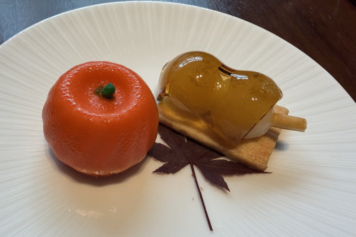 メープルのブリュレを入れた栗に見立てたマロンムース。トゥルントゥルンの食感に、ケシの実がぷちぷちしていて楽しい食感でした。