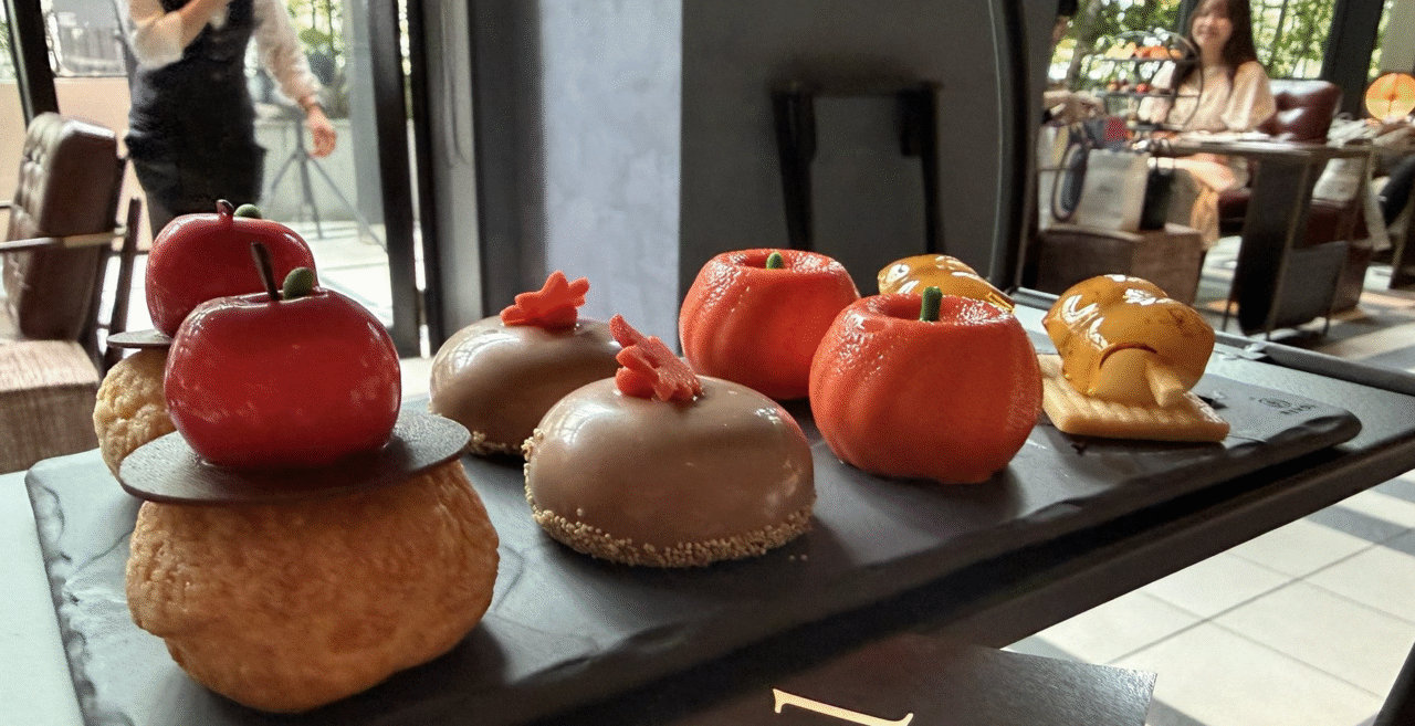 色鮮やかな紅葉色やオレンジのスイーツたちが、まるで秋の森を小さく切り取ったように並びます。