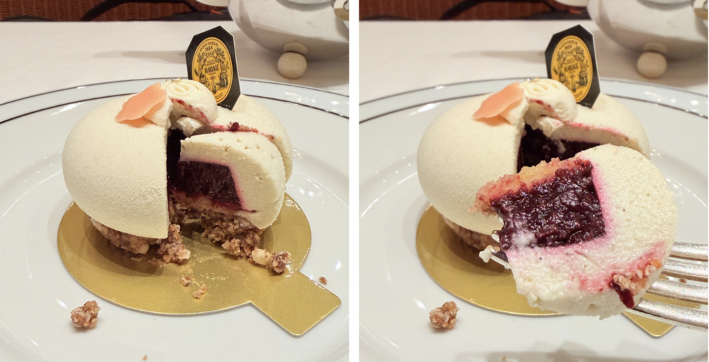 フォークを入れると、外側はミルクのブランマンジェのようなムースで、まるで雲のようにふわっふわ。口の中でスーッと溶けていきます。 そして中からは、濃厚で甘酸っぱいチェリーのコンポートがトロリと顔を出します。この酸味が、ミルクの優しい甘さと絶妙なバランス!