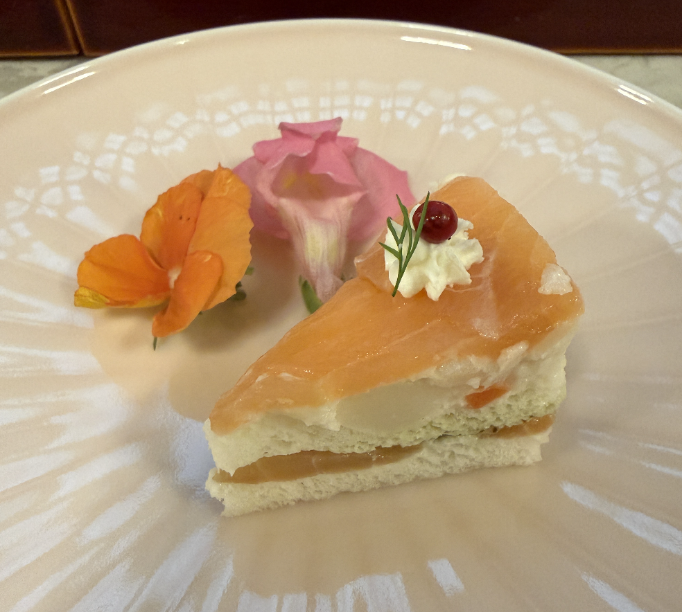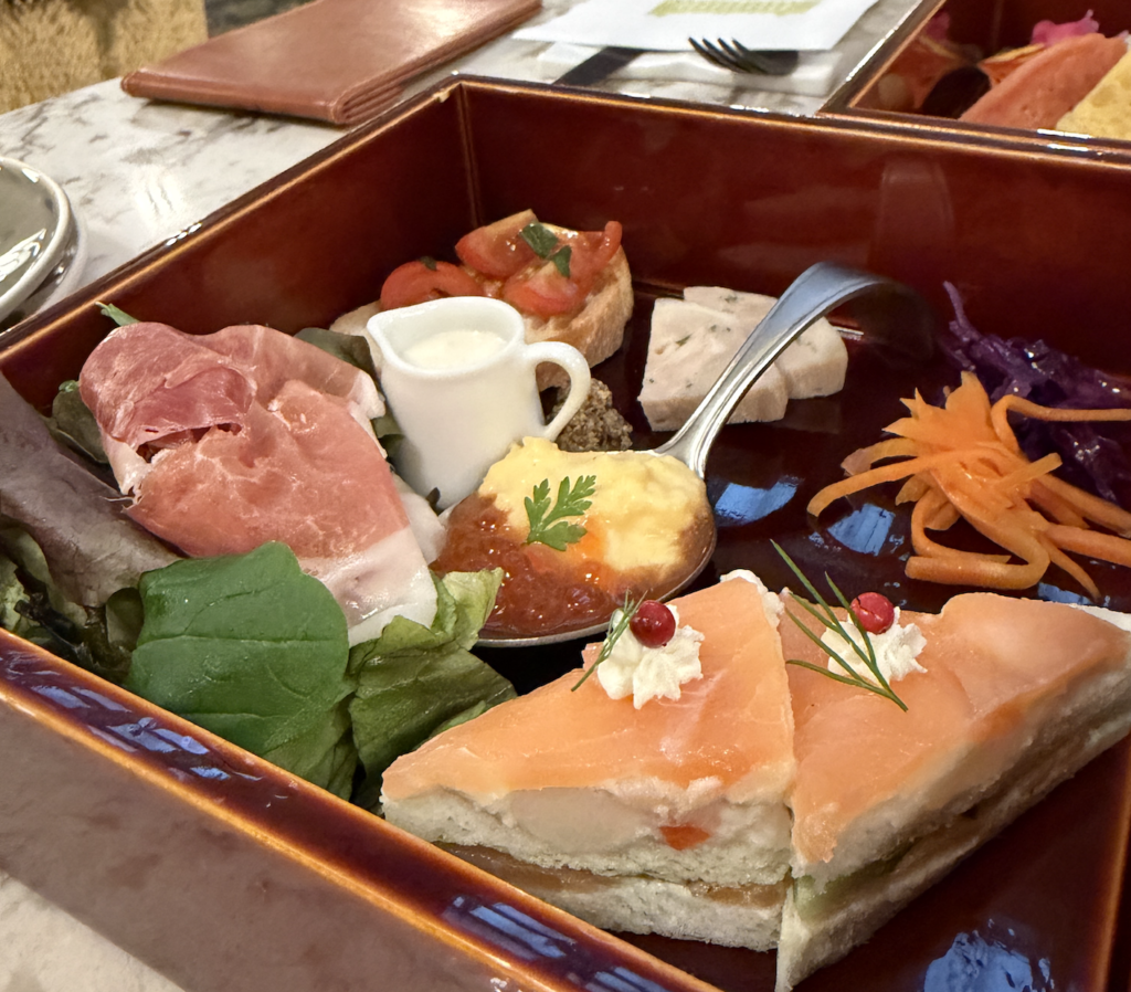 中段のセイボリーも充実しています。鮮やかなサーモンのサンドイッチに、たっぷりの生ハム、そしてイクラが添えられた贅沢な一品まで。スイーツの合間にいただく塩気がちょうどよく、最後まで飽きずに楽しむことができます。