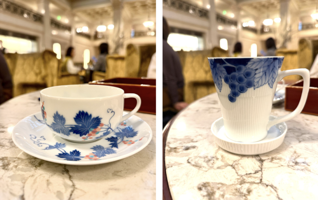 提供されたティーカップは、宮内庁御用達として知られる「香蘭社」のものでした。薄く・軽く・透き通るようななめらかな白磁に、繊細な色合いで描かれた葡萄の葉。カップの縁の滑らかな口当たり素敵なカップでした。
