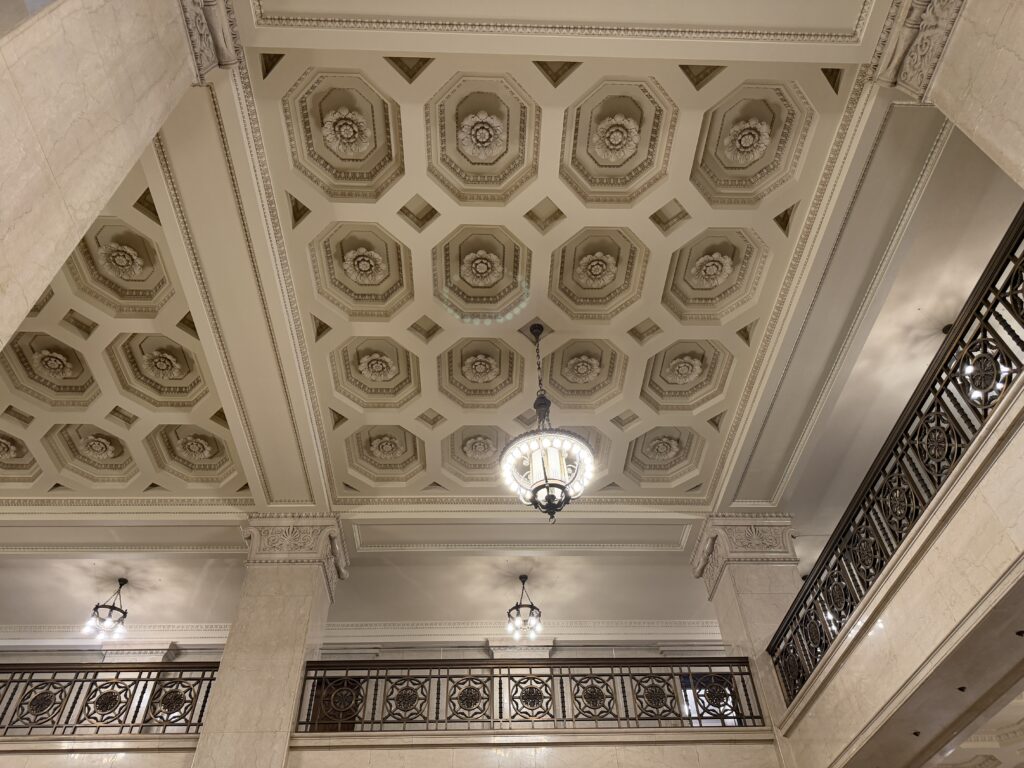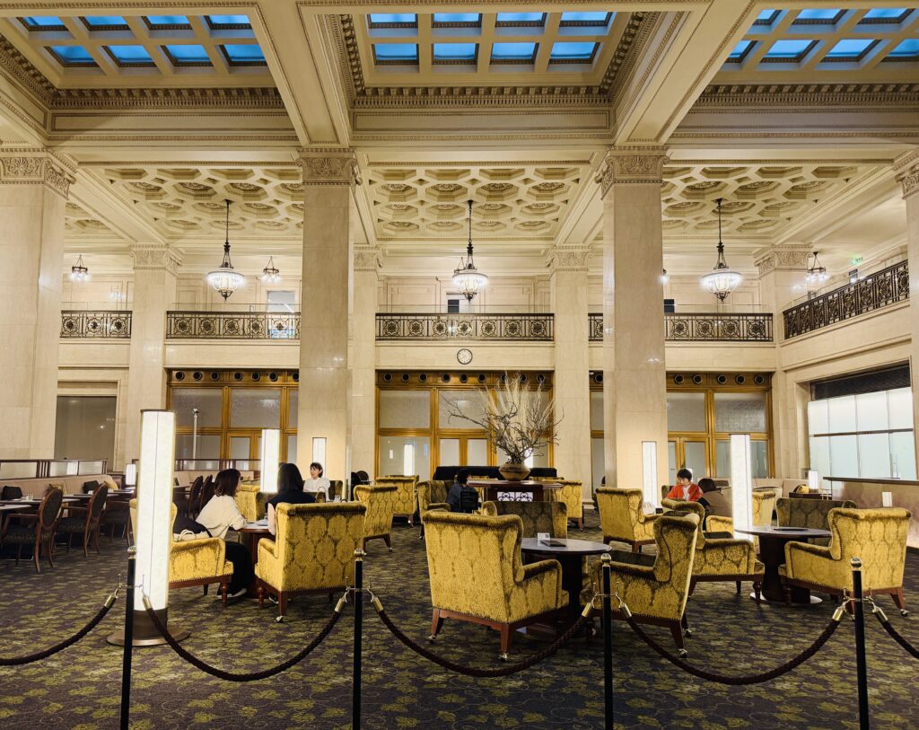 高い天井に施された精緻な装飾、クラシカルな照明、そしてゆったりと配置されたふかふかのソファ。どこを切り取っても絵になる美しさで、日常の喧騒から完全に切り離された優雅な時間が流れていました。