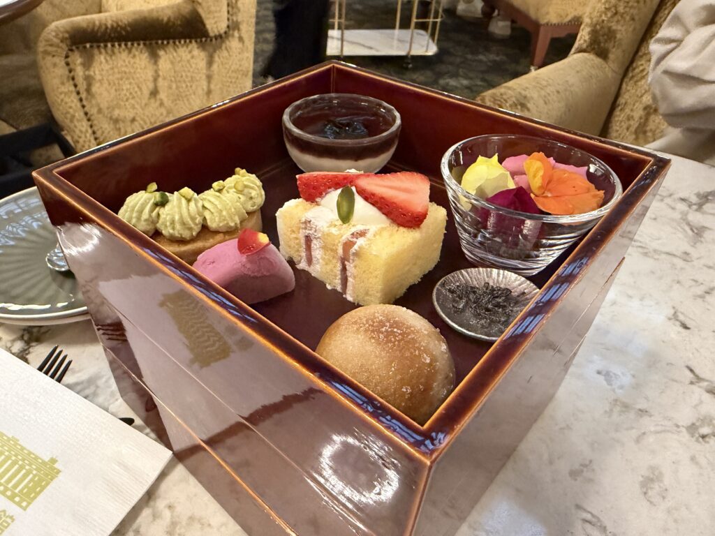 今回のお目当ては、こちらのアフタヌーンティーセットです。一般的なティースタンドではなく、なんと「お重」で提供されるんです!