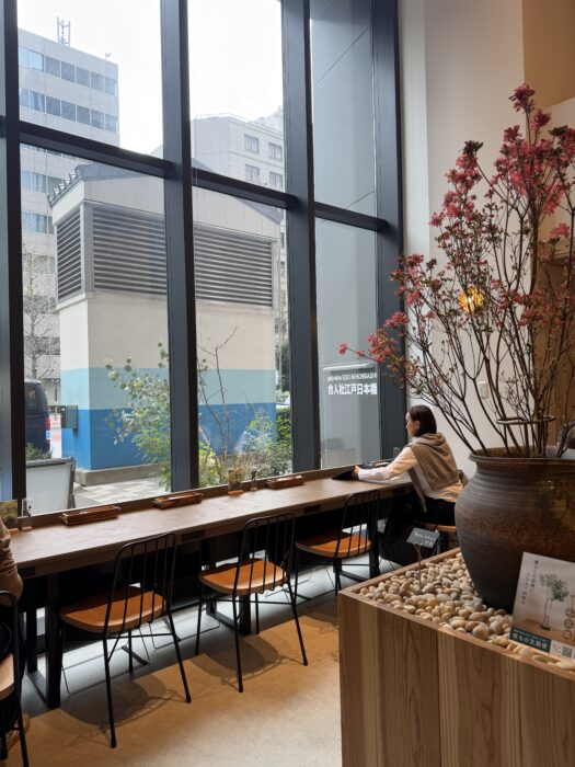 日本橋エリアの落ち着いた街並みの中にある「SiKiTO cafe」。 中に入ると、天井が高く開放的な空間が広がっています。