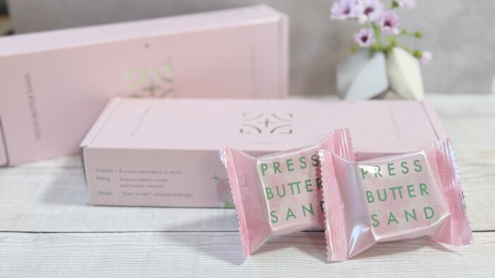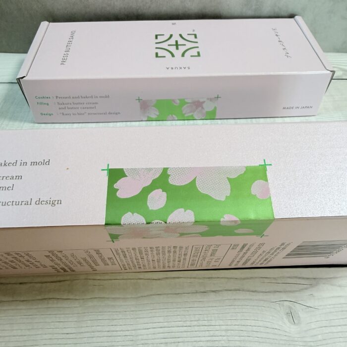 「PRESS BUTTER SAND」の季節限定シリーズは、毎回パッケージの美しさに目を奪われます。今回の〈桜〉は、淡いピンクにパールの光沢があるとっても可愛いパッケージ。ベビーピンクの色味ですが、ブルー寄りで今までプレスバターサンドのパッケージは、洗練されていて、大人っぽい感じも出しているのは、さすがです!また、光沢のあるグリーンのロゴが映える!箱を止めているシーも桜で、春爛漫なデザインでした。